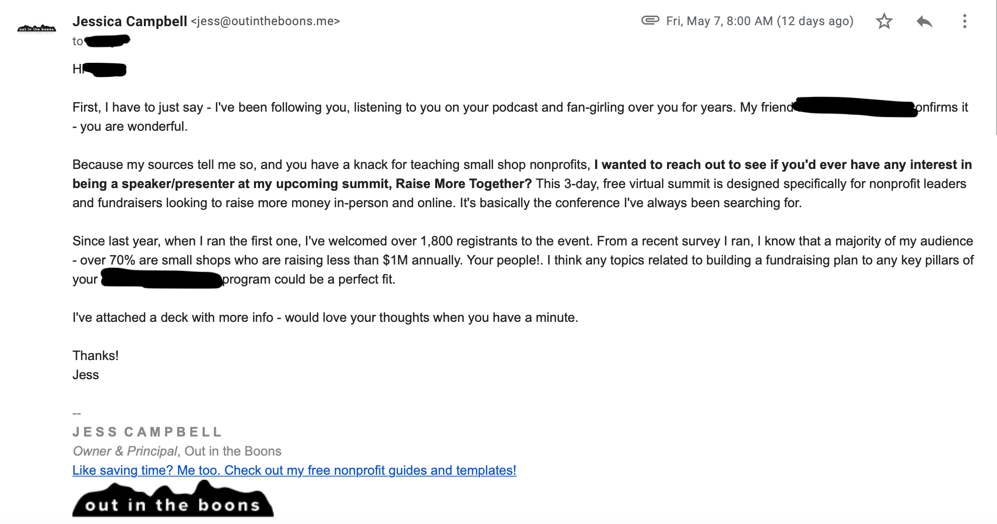 Therefore, I work to make my outreach as much about them as possible. Will this help them get in front of their ideal customer? Will this give them credibility in the space? Will this give them a speaking opportunity they’ve been searching for? Whatever it is - I work to make my outreach all about them and not at all about me.